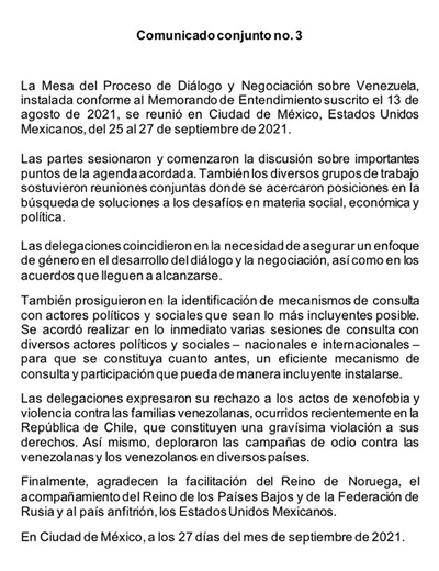 Comunicado conjunto Nro 3 de las partes de la mesa de diálogo y negociación de Venezuela en México Comunicado conjunto Nro 3 de las partes de la mesa de diálogo y negociación de Venezuela en México