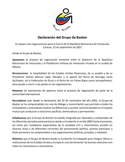 Grupo de Boston expresó este miércoles 22 de septiembre a través de un comunicado, su apoyo al proceso de negociación entre el gobierno y la plataforma unitaria, iniciado en la ciudad de México. Además agradecen la hospitalidad del gobierno mexicano y la facilitación del Reino de Noruega con el proceso.