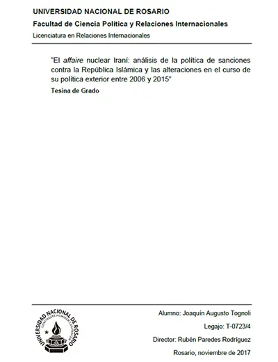 Joaquín Tognoli, investiga las medidas tomadas por un grupo de países liderados por Estados Unidos, para sancionar el Programa Nuclear Iraní. Por ello, el autor en un primer momento, describe las características del Programa Nuclear Iraní, y analiza sus implicaciones para la nación, la región, y para las potencias del sistema internacional.