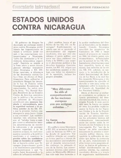 El artículo de la Revista Mensaje relata el embargo económico impuesto desde Estados Unidos a Nicaragua, bajo la administración Reagan. Cuyo objetivo fue el de prohibir las importaciones y exportaciones de bienes y servicios de Nicaragua con el país norteamericano.