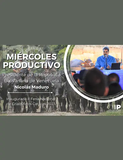 El presidente de la República, Nicolás Maduro Moros, inauguró durante el “Miércoles Productivo” la II Feria Nacional Criabúfalos Venezuela 2023, en el Parque Simón Bolívar, ubicado en La Carlota, estado Miranda. El jefe del Estado destacó que la cría del búfalo registró un crecimiento entre el 14 % y 17 % a escala nacional para agosto de 2022.